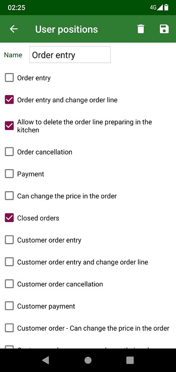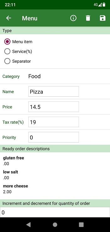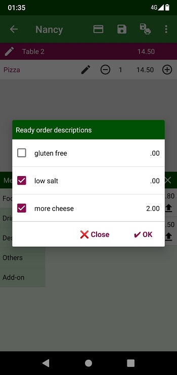 • Sie können fertige Auftragsbeschreibungen definieren. Dies sind zusätzliche Eigenschaften für Menüpunkte. Wenn Sie möchten, können Sie einen Preis für diese Funktionen festlegen. Sie können als Unterkategorien fungieren.