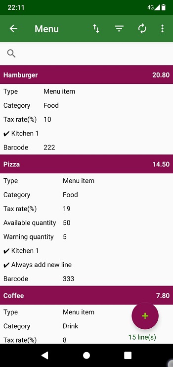 • Menüpunkte bestehen grundsätzlich aus Kategorie, Name, Preis und Steuersatz.